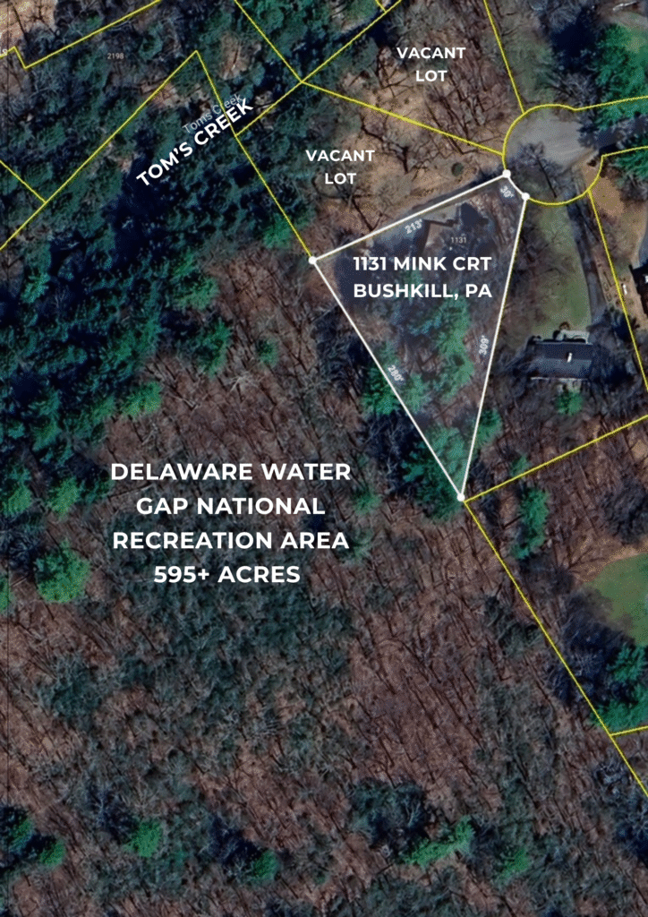 Step onto the covered front deck in the morning and you’ll hear Tom’s Creek in the distance. Trees, not rooftops, frame your view. One side of the property borders land within the Delaware Water Gap National Recreation Area — permanently protected open space that will never be developed. Behind the home, neighboring property extends toward those same preserved lands, with homes positioned on the opposite side of their lots.