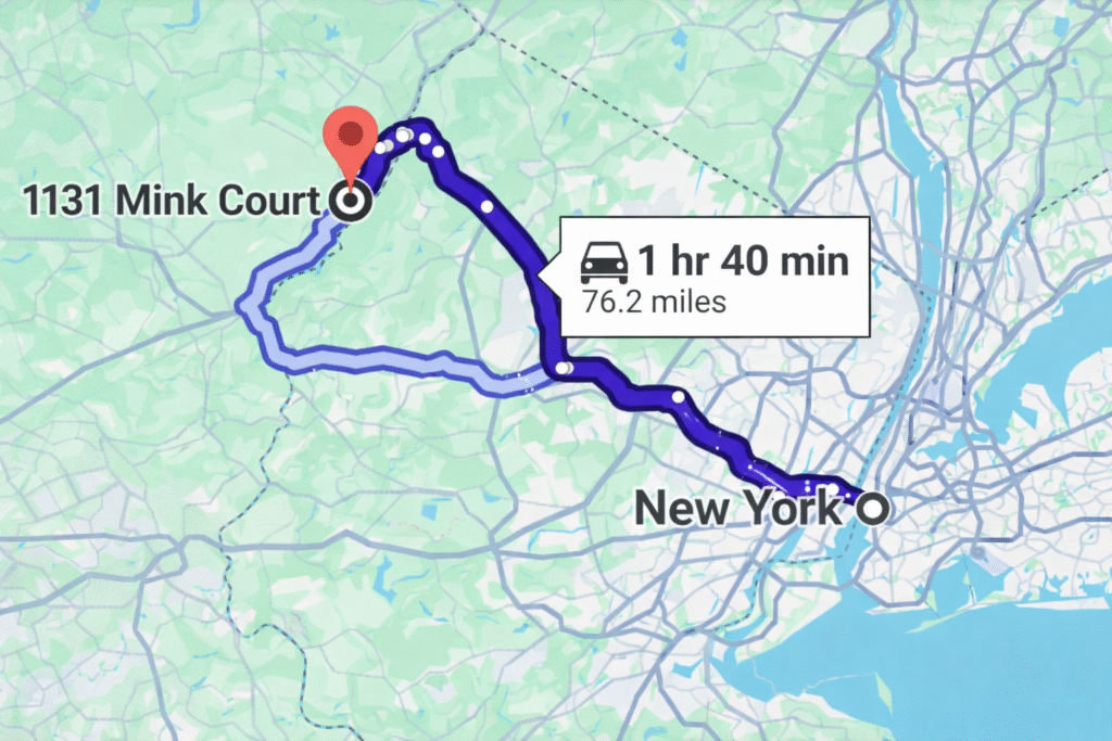 1131 Mink Court is approximately 77 miles to New York City, with access via I-80, I-84, or through Milford or Dingmans Ferry connecting into New Jersey corridors.